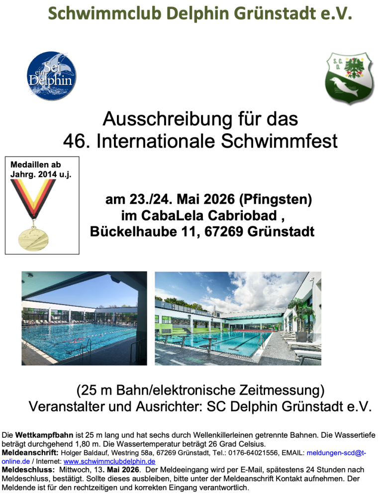 Wie auch im letzen Jahr wird der SC Delphin 2026 sein traditionelles Pfingstschwimmfest wieder in Grünstadt ausrichten. Der Wettkampf findet im Cabriobad "CabaLela" statt und ist damit für alle Wetterlagen bestens gerüstet. Bei gutem Wetter gibt es bei geöffnetem Dach Freibad-Atmosphäre, wenn es regnet oder zu kalt ist, wird das Dach geschlossen.